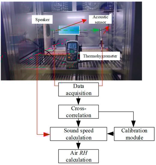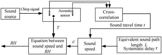 At present, the available sound sources for the measurement of air RH by the acoustic method include ultrasonic waves and low-frequency audible sound waves [,]. Ultrasonic waves are mainly used for short-distance measurement due to their easy attenuation []. Low-frequency sound waves have a smaller attenuation and a longer propagation distance, which have been used to measure indoor temperature, furnace flame temperature, and lake water temperature [,,]. However, the use of low-frequency sound waves to measure air RH is relatively limited [,]. Therefore, here, an air RH measurement method based on low-frequency sound waves and cross-correlation signal processing techniques is proposed.