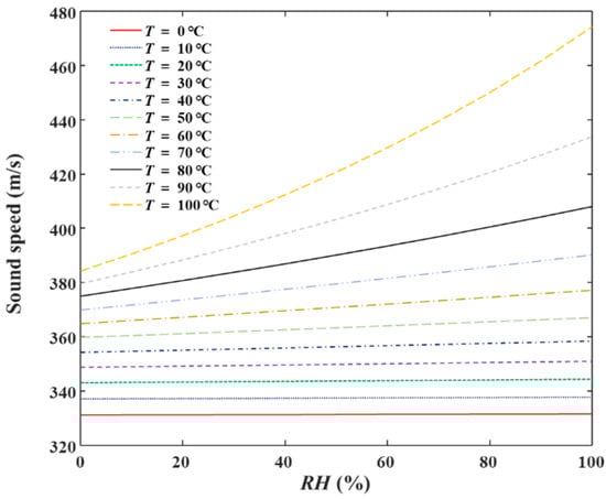P in the laboratory where this research was undertaken was 102.2 kPa. Assuming T is 0–100 °C, RH is 0–100%, and air constituent concentrations are the same as the standard air, then c calculated from Equation (2) is as shown in Figure 2. The sound speed has a monotonic relationship with air RH for a given air temperature, T. With the measured c, T, P, and assuming that air constituent concentrations are the same as that of standard air, RH is calculated inversely from Equation (2). From Figure 2 it can be inferred that the influence of RH on sound speed is low in the low-temperature range, while the influence is obvious in high-temperature ranges. The accuracy of existing traditional temperature sensors is high. This means that the sound speed measurement accuracy needs to be high enough when the air temperature is low. Therefore, a couple of reference RH experiments were conducted to obtain the equivalent sound path length between the two acoustic sensors and the systematic delay.