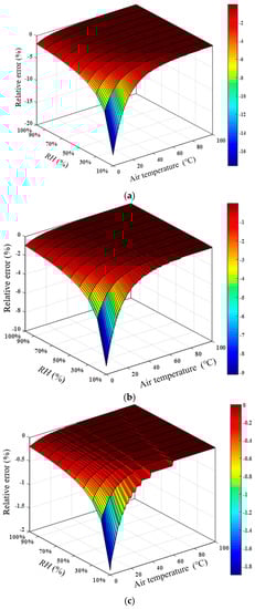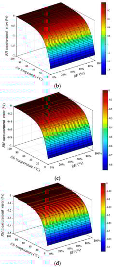 Measurement error of RH caused by the variation in T. (a) The temperature error measured by the thermometer is ±1 °C. (b) The temperature error measured by the thermometer is ±0.5 °C. (c) The temperature error measured by the thermometer is ±0.1 °C.