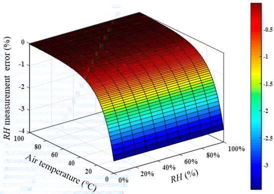 In the study of the influence of temperature on the RH measurement, it is assumed that the air constituent concentrations and atmospheric pressure are basically unchanged during the measurement process (standard air, atmospheric pressure is 102.2 kPa), which is also in line with the general actual measurement environment. Assuming that actual RH is 10–100% (from 10% is used to calculate the relative error of RH) and T is 0–100 °C, the sound speed can be calculated using Equation (2). Assuming that the actual measured sound speed is equal to the ideal sound speed value, that is, there is no error in the sound speed measurement, the temperature error measured by the thermometer was ±1, ±0.5, and ±0.1 °C. RH of air can be calculated with the measured T and sound speed. Then, the relative errors of the RH measurement results caused by the actual temperature measurement error were acquired, which are shown in Figure 3a–c. The relative error of the RH measurement caused by temperature fluctuation was relatively low in the high-temperature and high-RH area. The relative error was relatively high in the low-temperature and low-humidity area, which is also the limitation of the acoustic humidity measurement. Therefore, to improve the accuracy of the RH measurement, it is necessary to ensure the accuracy of the temperature measurement. The accuracy of the reference temperature measurement device used in the experiments can reach ±0.5 °C. More accurate thermocouples or thermal resistances can be used, and the temperature measurement accuracy can also be improved by using multi-point measurement and averaging.