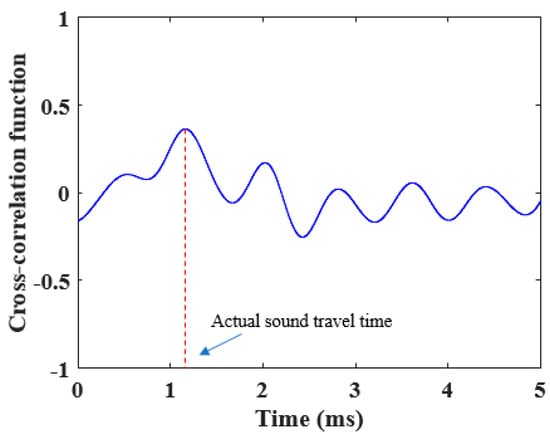 The location of the peak point in is the actual delay point, which is the actual sound travel time. Based on the actual measurement of the received sound wave components, there are two overlapping components of reflected sound and direct sound. Therefore, to minimize the impact of reflected sound waves on the cross-correlation results, the maximum delay point, M, was set to 10,000 (5 ms), which is larger than the possible actual acoustic travel time.