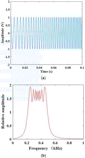 Time domain waveform and frequency spectrum of the ideal linear chirp signal. (a) Time domain waveform. (b) Frequency spectrum.