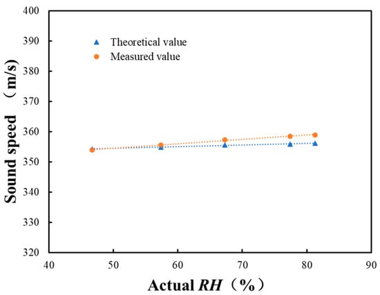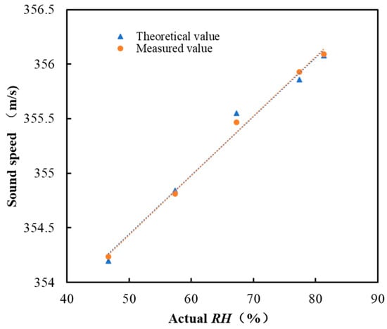 The constant temperature and humidity chamber can adjust the air inside to different temperature and humidity points. The specific temperature and corresponding RH are shown in Table 1. Measurements were repeated 10 times under each RH point. The temperature data values were the average values of measured temperatures by the CEM DT-625 thermo-hygrometer. The average values and standard deviations (STD) of the sound travel time are listed in Table 1. From Table 1, with the increase of RH, sound travel time decreased, which indicates the increase of the sound speed. This complies with the relationship shown in Figure 2. Assuming that the distance between acoustic sensors (0.4 m) is the sound path length and there is no systematic delay, then the sound speed can be measured with the sound travel time in Table 1. The ideal sound speed at each temperature and RH point can be acquired with Equation (2). Figure 11 shows the measured and the theoretical values of sound velocity at each humidity point. The measured value deviates from the theoretical value. One reason is the error in the actual sound path length, which was measured by a tape measure. Another reason is the theoretical sound speed is the ideal value. Therefore, the equivalent sound path length, L, and the systematic delay, τ, need to be calculated through reference RH experiments, and then sound speed can be measured more accurately with Equation (1).