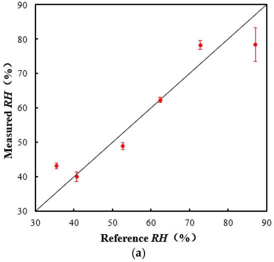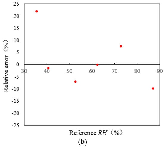 To validate the acoustic method, air in the chamber was set to another 8 RH points, which were 35.5%, 40.7%, 52.7%, 62.4%, 72.8%, and 87.1%. The corresponding air temperature was measured to be 38.3, 37, 37.1, 37.6, 37.8 and 37.6 °C. Measurements were repeated 10 times at each RH point. Figure 13a, b show the average values and relative errors of the measured RH. The abscissa is the actual air humidity measured by the thermo-hygrometer. The standard deviation of the measurement results was within 4.8%. The relative error of the measured values was within 9.9% in the RH range of 40.7–87.1%. The error was larger when the humidity was low, and the error was less than 10% when the humidity was high. This is also in line with the previous theoretical analysis in Section 2.1. In the low-temperature and low-humidity area, the humidity measurement had high requirements on the accuracy of the sound speed measurement. However, the sound speed measurement was affected by many factors, and thus the measurement error was larger. The error can be decreased by increasing the actual sound path length and the accuracy of the measured sound travel time.