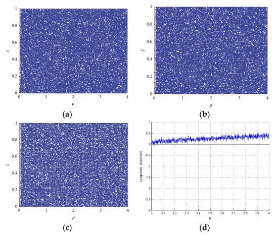 Distribution of intertwining logistic map; (a) bifurcation diagram of sequences x; (b) bifurcation diagram of sequences y; (c) bifurcation diagram of sequences z; (d) Lyapunov exponents diagram.