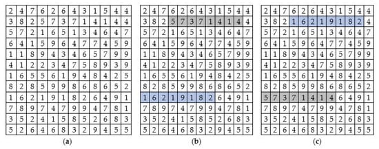 Block-swapping row-wise: (a) the initial state of the image; (b) the highlighted blocks; (c) the state of the image in (a) after block-swapping.