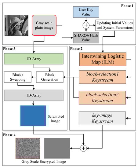 In the literature, many image encryption schemes exist for grayscale [1,2,3,4,5,6,7,8,9,10] and color images [11,12,13,14,15,16,17,18,19]. Most of these encryption algorithms are based on chaotic maps. These systems/maps produce random data, which are utilized in encryption processes, including transposition (scrambling or confusion) and substitution (diffusion). These maps have the characteristics of randomness, unpredictability, ergodicity, aperiodicity, mixing, etc. They are fully dependent on their primary conditions and system parameters. Thus, they produce different streams of random numbers upon minute changes in their preconditions and parameters. This is why researchers have used them widely in designing their image encryption schemes [20,21,22,23,24,25]. In this study, the intertwining logistic chaotic map (ILM) is used to fulfill the requirements of chaoticity in the transposition and substitution processes. The ILM produces three chaotic streams and is much more unpredictable in nature [26].