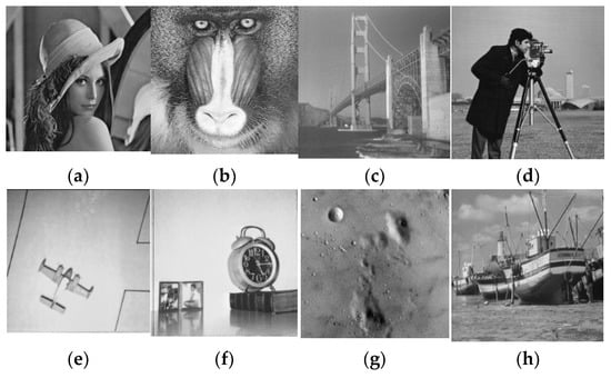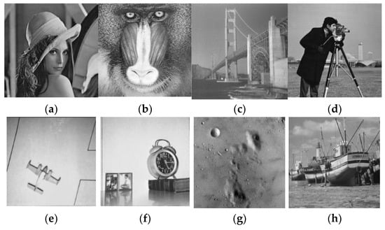 Original input images: (a) Lena; (b) baboon; (c) bridge; (d) cameraman; (e) airplane; (f) clock; (g) moon; (h) ship.