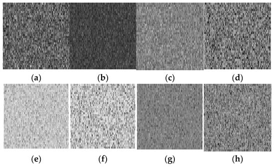 Scrambled images: (a) Lena; (b) baboon; (c) bridge; (d) cameraman; (e) airplane; (f) clock; (g) moon; (h) ship.