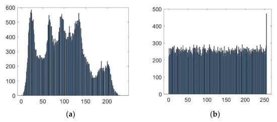 In a given image, the pixel intensity value distribution is provided through the histogram. For a plain image, the histogram has slanting bars, which can be exploited by a hacker to obtain useful information about the image. To resist the statistical attack, a cipher must be capable of converting the slanting bars into a well-organized plain bar with almost the same distribution. In this way, a hacker would not be able to obtain any useful information. The histograms of both plain and cipher images of Lena are shown in Figure 8. Figure 8a shows that the histogram of the Lena plain image has curved slanting bars. In contrast, Figure 8b shows that the histogram is a well-organized plain bar with uniform distribution. These well-organized plain bars provide great immunity against the histogram attack. This shows that the proposed scheme is efficient.
