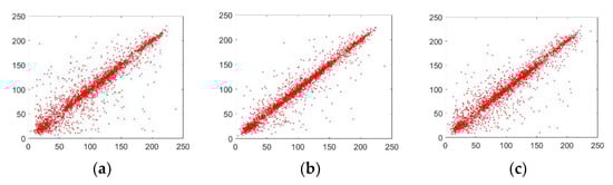 Here, A denotes the number of pixels; the neighboring pixels are referred to by x and y. The correlation distribution for the adjacent pixels is shown in Figure 9.