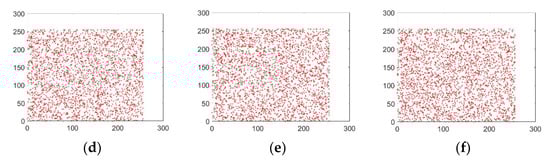 The adjacent pixel correlation distribution with directions: (a) horizontal component of the input Lena plain image; (b) vertical component of the input Lena plain image; (c) diagonal component of the input Lena plain image; (d) horizontal component of the generated Lena encrypted image; (e) vertical component of the generated Lena encrypted image; (f) diagonal component of the generated Lena encrypted image.