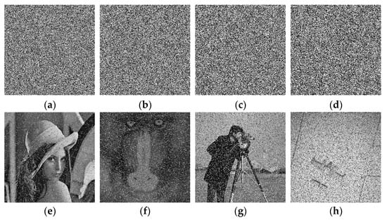 Pepper and salt noise attacks with different densities: (a) Lena cipher image by accumulating pepper and salt noise with noise density 0.1; (b) baboon cipher image by accumulating pepper and salt noise with noise density 0.2; (c) cameraman cipher image by accumulating pepper and salt noise with noise density 0.3; (d) airplane cipher image by accumulating pepper and salt noise with noise density 0.4; (e) the decrypted image obtained from (a); (f) the decrypted image obtained from (b); (g) the decrypted image obtained from (c); and (h) the decrypted image obtained from (d).