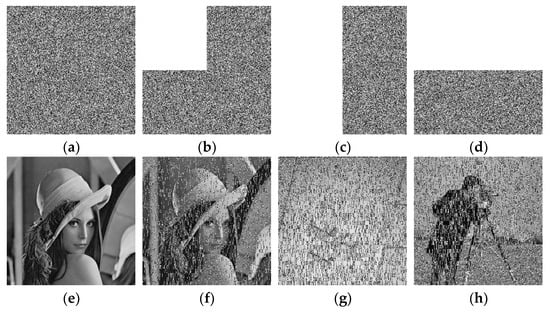 Analysis of the data loss attack: (a) 0% data loss in the encrypted image of Lena; (b) 25% data loss in the encrypted image of Lena; (c) 50% data loss in the encrypted image of the airplane; (d) 50% data loss in the encrypted cameraman image; (e) decrypted Lena image from the image drawn in (a); (f) decrypted Lena image from the image drawn in (b); (g) decrypted airplane image from the image drawn in (c); (h) decrypted cameraman image from the image drawn in (d).