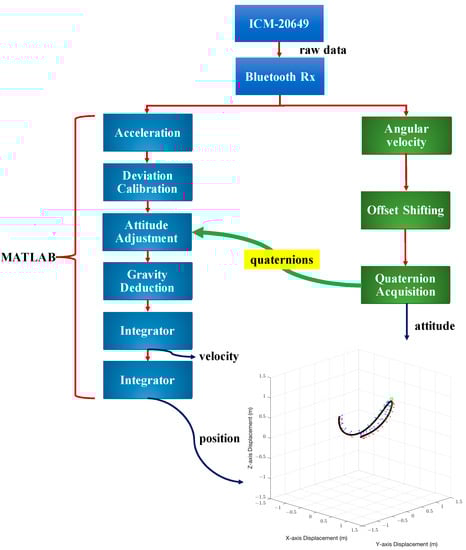 After completing the transformation of the coordinates and the gravity compensation, we proceed to the trajectory construction part. The velocity can be obtained by integrating the acceleration once, and the displacement can be obtained after the second integration. The displacement between every two sampling points can be used to reconstruct the trajectory of the sensor movement.