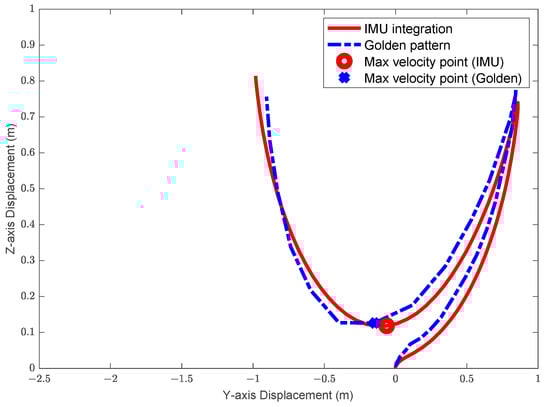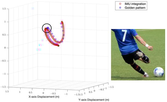 On the football field, whether it is passing or shooting, the velocity of the ball is a crucial factor. We hope to observe the maximum velocity of the athlete’s foot swing and where the maximum value occurs so that we can help athletes transmit the most kinetic energy to the ball. With the golden pattern obtained by Tracker, we can compare the velocity of the sensor with the velocity from the video. Figure 4 is a 2D motion trajectory diagram, the blue cross is the position where the maximum velocity appears in the theoretical trajectory, and the red circle is the position where the maximum velocity appears in the IMU motion trajectory.