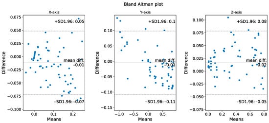 To validate the reliability of the system, we utilize the high-speed cameras to obtain the golden pattern for the trajectory. According to the systematic review study [], one of the most commonly used measures of agreement is the Bland–Altman plot. It is a scatter plot which shows the relationship between two methods. The metric is used in this study to evaluate the accuracy of the trajectory reconstructed from the IMU data.