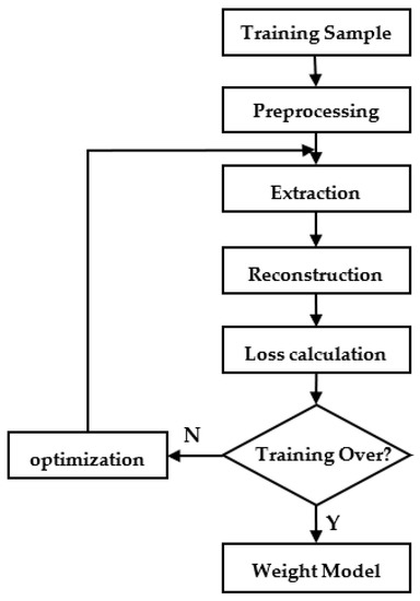 The encoder learns the training data to obtain the feature space. Then, the decoder reconstructs the feature into the source data. The loss function is calculated and optimized iteratively until the model error reaches the expectation and the final weight model is saved. The algorithm flow of model training is shown in Figure 3: