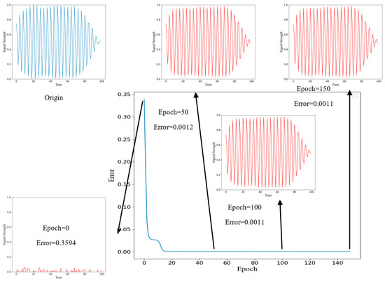 After data preprocessing operations such as subsequence division and normalization, the training samples are input into the ResNet-AE network for feature extraction, and a feature space of 8 × 1 is obtained. After the reconstruction of the decoder, the feature vector is restored to the dimension of the original data to obtain the reconstructed sequence signal. The comparison between the reconstructed signal and the input signal is shown in Figure 4. In the figure, blue is the original signal, and red is the reconstructed signal. The figure shows the reconstructed signal when the epoch is 0, 50, 100, and 150, respectively. When the epoch is 0, because the model’s weight at the initial training stage is a random value, the reconstructed signal greatly differs from the original signal. With the continuous iteration and optimization of parameters, when the epoch is 50, the reconstruction error of the network reaches a low level, and the original signal can be reconstructed well. Until the end of the training, the reconstruction error is unchanged, and the reconstruction effect tends to be stable. It can be seen from the figure that for normal signals, the ResNet-AE model can be well reconstructed, and the reconstructed signals are consistent with the original signals.