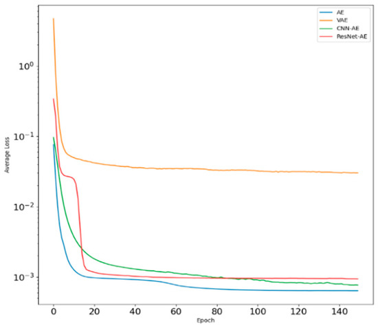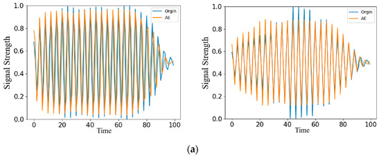 Figure 5 shows the changes in loss functions during the training of several common models. Among them, the loss functions of the four models converge rapidly. When the epoch reaches 150, the ResNet-AE model tends to be flat and stable, and the loss functions of the AE and CNN-AE models still have a downward trend. Although the loss functions of VAE converge rapidly, there are small fluctuations and fluctuations. At the same time, the loss functions of stable models are large, indicating that the network reconstruction effect is poor. It can be seen that the ResNet-AE model has certain advantages in the reconstruction of normal signals.