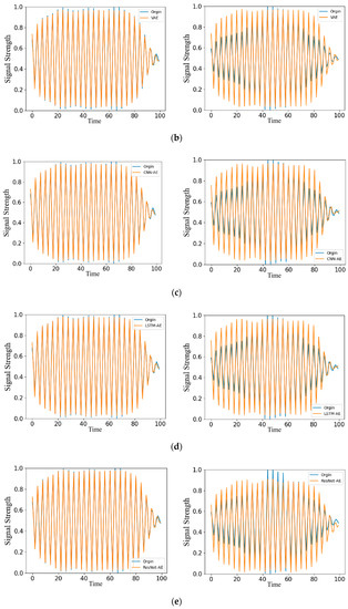 Reconstruction signal of common anomaly detection models: (a) Abnormal detection results of AE; (b) Abnormal detection results of VAE; (c) Abnormal detection results of CNN-AE; (d) Abnormal detection results of LSTM-AE; (e) Abnormal detection results of ResNet-AE.