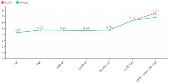 The complexity of the model is evaluated by calculating the FLOPs and Params of the commonly used anomaly detection models. Figure 11 shows the logarithm of the FLOPs and Params of each model. The FLOPs and Params of the GAN-based model are 2–3 orders of magnitude higher than those of the AE-based model. It indicates that the complexity of the GAN-based model is much higher than that of the AE-based model; The relevant numerical difference of the model based on AE is within one order of magnitude, and the complexity is equivalent. Therefore, the ResNet-AE model not only ensures high detection capability but also has a more concise model structure.