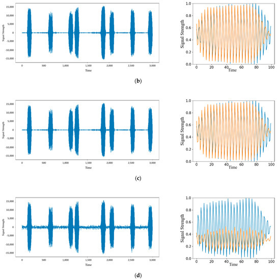 Reconstructed signals with different SNR: (a) Original signal and abnormal detection results; (b) Signal with SNR = 90 dB and its anomaly detection results; (c) Signal with SNR = 60 dB and its anomaly detection results; (d) Signal with SNR = 30 dB and its anomaly detection results.