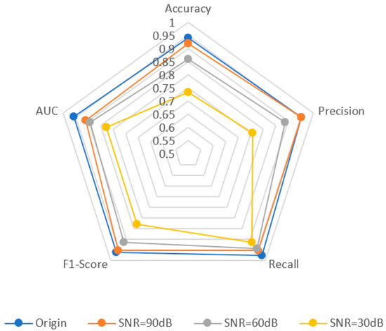 This experiment explores the influence of abnormal detection results on the noise of radar signals. Gaussian white noise is added to the original signal, and the SNRs are 90 dB, 60 dB, and 30 dB, respectively. Repeat the above experimental process to obtain the experimental results, and compare them with the experimental results of the original signal. Figure 12 shows the signal reconstruction effect. As the signal-to-noise ratio decreases, the difference between the reconstructed and original signals becomes larger. When the signal-to-noise ratio is 90 dB and 60 dB, the original signal can still be reconstructed, and the error change is not obvious; When the signal-to-noise ratio reaches 30 dB, the reconstructed signal is completely distorted. Figure 13 shows various evaluation indicators under different signal-to-noise ratios. The Accuracy, Precision, and F1 values generally show a downward trend with the reduction of SNR but remain at a high level. When the signal-to-noise ratio is reduced to 30 dB, the Accuracy and Precision decline significantly, indicating that at the 30 dB signal-to-noise ratio level, noise greatly interferes with the abnormal detection of signals. Due to the increase in noise, it is difficult to extract the characteristics of signals, thus affecting the error of reconstructed signals. As a result, some normal signals are difficult to reconstruct and are judged as abnormal, which has little impact on detecting anomalies, so the change in Recall is relatively stable. The model performs well under different signal-to-noise ratios and can adapt to data sequences with low signal-to-noise ratios.