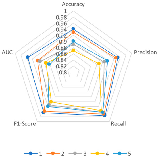 In this experiment, five groups of signals generated by different radar radiation sources are selected for experiments, and the anomaly detection results of different radar signals are recorded. As shown in Figure 14, the training set is generated by Equipment 1, and its reconstruction effect is significantly better than that of other equipment. The signals generated by other equipment are unfamiliar signals, of which the reconstruction effect of Signal 2 is ideal. The reconstruction effect of other signals is general. The difference between the reconstructed and original signals mainly lies in the rising or falling edge. The reconstruction effect is better in the middle of the signal. Figure 15 shows the various evaluation indicators of different radar signals. Since Equipment 1 is the equipment for generating training set signals, all indicators in the five groups of signals are the highest. Although the Accuracy, Precision, and F1 values of other signals are slightly lower than Signal 1, they are all above 0.84, reaching a high level. At the same time, the Recalls of the five groups of signals are all above 0.94, retaining the network’s ability to distinguish anomalies. It also maintains the characteristics of a low missed detection rate for unfamiliar signals, and the values of various indicators are stable, which shows that the model has good anomaly detection ability and strong universality.