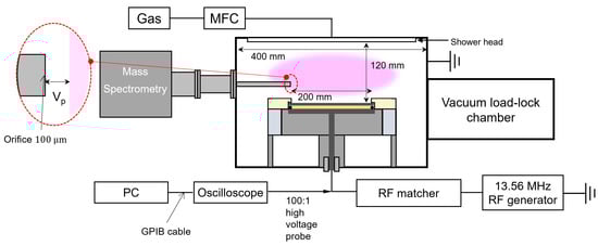 To validate the concept of the monitoring system, experiments were conducted with an asymmetric capacitively coupled plasma (CCP) source to which 13.56 MHz RF power was applied. Figure 1 shows a schematic of the CCP source where the diagnosis and determination of the plasma parameters such as a voltage waveform and IEDs were performed. The CCP chamber had a diameter of 200 mm and contained parallel-plate electrodes separated by 120 mm. The bottom electrode was surrounded by a ceramic ring for electrical insulation from the ground, and connected to a 13.56 MHz RF generator via an L-type matching network. The top electrode, which had a shower head to uniformly inject gases into the processing chamber, was grounded. A QMS (PSM, Hiden Analytic, Warrington, Cheshire, UK) that could measure IEDs by collecting energetic ions escaping from plasma was mounted to the chamber sidewall via a port. The vacuum system in this processing chamber consisted of a rotary pump and turbo molecular pump that arweree equipped to produce base pressure in the order of Torr. We injected 100 sccm Ar gas through the shower head, and a variable-conductance valve between the processing chamber and the turbo molecular pump controlled the pressure.