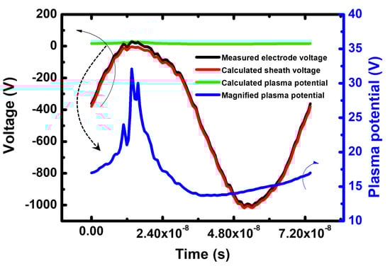 The analysis of electrode voltage allows for obtaining the plasma potential via electrical sheath model Metze, Erine, and Oskam (MEO) [42]. The details of this model are described in Section 3.2.1. Thus, this model was used to obtain the plasma potential without any invasive diagnostics in our system, which requires the electrode voltage waveform as an input parameter. The sheath voltage waveform was obtained by subtracting the calculated plasma potential from the measured electrode voltage.