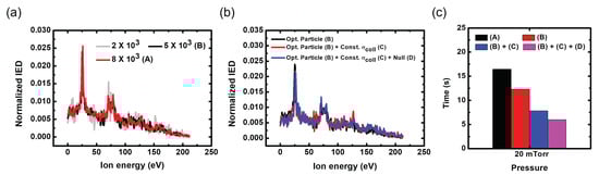 (a) Calculated IEDs according to the number of ions; (b) calculated IEDs; (c) corresponding calculation times with additional speed-up methods. (A) Nonoptimized particles 8 × without speed-up methods; (B) optimized particles of 5 × without speed-up methods; (C) constant cross-section method; (D) null collision method.