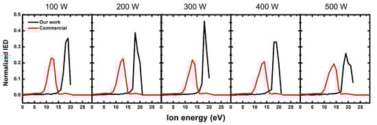 Figure 6 shows the comparison between the IEDs measured via our noninvasive monitoring system and the commercial QMS with increasing RF power at a fixed pressure of 20 mTorr in Ar plasma. Figure 6 shows that the measured IEDs via the commercial QMS had a single energy peak because, at the frequency of this input RF power higher than the ion frequency, the ions could respond to a time-averaged sheath potential that was equal to a time-averaged plasma potential at the grounded electrode. As the input RF power increased, the energy peak also slightly changed from 12 to 13 eV because it did not significantly affect the plasma potential, but RF and DC self-bias voltages applied on the powered electrode increased [49,50,51]. The IED calculated with our monitoring system showed similar changes according to the power variation measured via the commercial QMS, which implies that IEDs of both our and commercial diagnostics were in good agreement with each other.