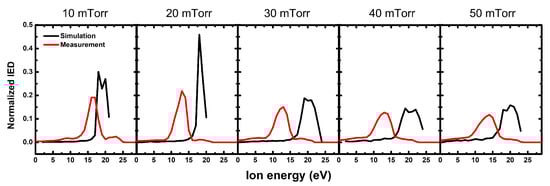 Figure 7 plots the IEDs of both diagnostics as a function of pressure ranging from 10 to 50 mTorr at a fixed input RF power of 300 W. The IEDs obtained from the commercial QMS with increasing pressure had similar trends of a single energy peak, and that changed with power variation. From the aspect of a single energy peak, there was a slight change because as chamber pressure changed from 10 to 50 mTorr, the electron temperature barely changed, which implied that the plasma potential remained almost unchanged. With increasing pressure, the ion energy distribution caused by the collision is broadened [45,52,53]. Figure 7 shows that the IED measured via the commercial QMS became broader as chamber pressure increased, which also appeared in the IED calculated with our monitoring system.