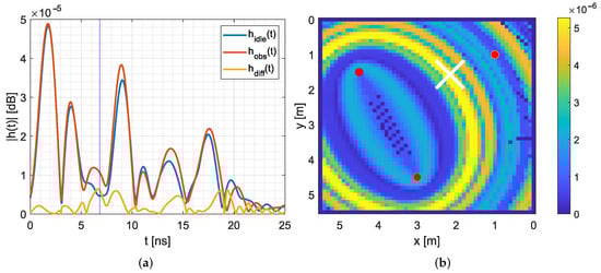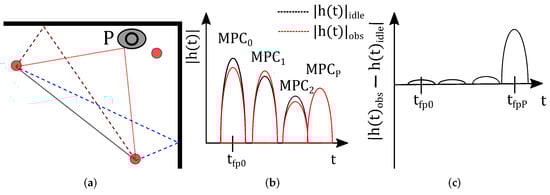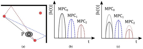 Figure 2b shows the CIR measurement while the target area is vacant (black dotted CIR). A person that stands in the middle of the target area (see Figure 2a) creates an additional MPC named , shown in Figure 2b as the red dotted line. Subtracting the CIR of the non-idle case from the CIR of the idle case shows differences due to the person within the target area; this step is called background subtraction. MSR now maps the time delay of the newly occurring MPC, which limits the possible position of the person within the target area.