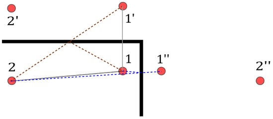 Figure 3 shows an exemplary multipath scenario with two walls. The black dotted line between Sensor 1 and Sensor 2 is the -th component, which is the direct path between the transmitter and the receiver. Additionally, we depict echo paths that are the first-order MPCs in blue and brown dashed lines. To determine the echo paths, the positions of virtual sensors , and are calculated. These virtual sensor positions result from mirroring the physical sensor positions on the walls, as shown as the gray line in Figure 3 on Sensor 1, e.g., the upper reflection (brown dashed line) is calculable with respect to virtual sensor position . The path length of the connection between 2 and equals the MPC’s length, and the connection’s intersection with the wall is the reflection point of the MPC. Therefore, we determine the path length and the resulting time delay .