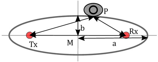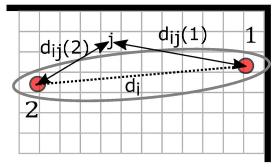 Figure 4 depicts the parameters. When the pixel j is inside an ellipse with the sensors in its foci, then the weight is assigned; otherwise, the weight is 0. When a person is outside the direct or echo path, this path will not affect the RTI system. The tuning parameter controls the width of the ellipse.