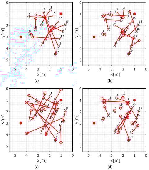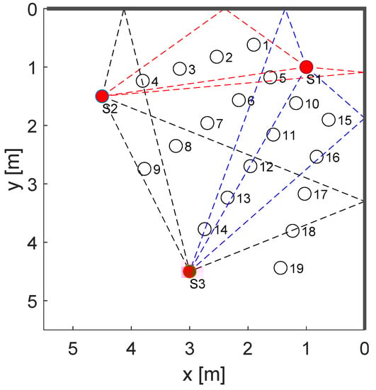 Figure 15a shows the reference positions (black circles) and the estimated positions (red circles) for conventional RTI and Figure 15b for MA-RTI. The conventional RTI is solely based on the three direct paths between the sensors. Therefore, the RTI system estimates the position of the person in the middle of the direct path (1,2) for position 1–7 and for the positions 17–19 that are outside of any direct paths. Position 9 is in the middle of the direct path of (2,3) and is estimated correctly. Positions 10–15 are a direct path between (1,3), the position estimated results in the middle of this MPC. Figure 15b shows the localization errors for MA-RTI. Whereas the RTI system results in a big cluster for positions 1–8, the localization errors of MA-RTI are overall closer to the ground truth positions. Still, position estimations for positions 10–19 are often between position 12 and 17, because different direct and echo paths overlap there.