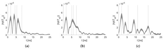 In the following, we describe how a person affects the MPCs that are extracted from the UWB CIR measurement: In Figure 1a, the person P located at position affects the direct path between two sensors () and the red dashed echo path (). When the target area is vacant, i.e., free of additional persons, we measure an idle CIR and determine the magnitude of the MPCs (see Figure 1b). We will later use this idle case to subtract the background and identify changes in the MPCs due to the position of the person. Changes in the respective MPCs, in comparison to the idle CIR, shown in Figure 1c, limit the possible locations of the person. To find the position of the person, radio tomographic imaging (RTI) [6,7,13,14] or fingerprinting (FP) algorithms [15,16,17] are used. RTI algorithms map changes in the signal paths and display them in a heat map. In this work, we enhance RTI both to use the direct and echo paths of the UWB signal and describe the mapping of changes in the MPCs into a heat map. Fingerprinting algorithms compare the distance of the channel measurements prerecorded at reference positions with measured observations to determine the position of the person. Other possibilities for localization are geometric approaches [18] and compressed sensing [19,20].