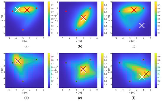 Figure 14 exemplary shows the result for all three methods for position 6. Figure 14a shows the result for MA-RTI. As the person is only in the proximity of (and not crossing) a few paths, the estimated position is approximately 1.5 m away from ground truth position of the person. The result for the multi-static radar is shown in Figure 14b. Although there is a local maximum at the ground truth position of the person, the estimated position is located at an ambiguity far away from the ground truth position. Figure 14c shows the result when both heat maps are combined. The estimated position is close to the ground truth; furthermore, ambiguities are reduced significantly.