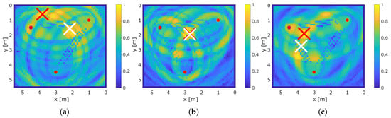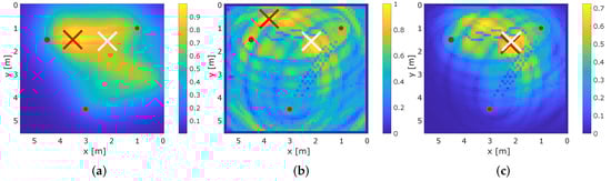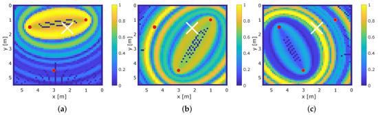 Figure 13a shows for sensor pair (1,2). As the person is not in the proximity of a signal path, the maximum of the heat map is at an ellipse perimeter close to the position of the person. At the of sensor pair (2,3) shown in Figure 13c, the global maximum of the heat map is at the ellipse perimeter of the position of the person. The ambiguity within is caused by sensor pair (1,3), as depicted in Figure 13b. There is a global maximum of the heat map at en ellipse perimeter at the position of the person, yet the global maximum is located at an ellipse perimeter approximately 2 m further. The global maximum is caused by the person affecting an MPC, which results in a peak in the CIR difference. This global maximum results in an ambiguity when we calculate the mean of the heat maps according to (20).