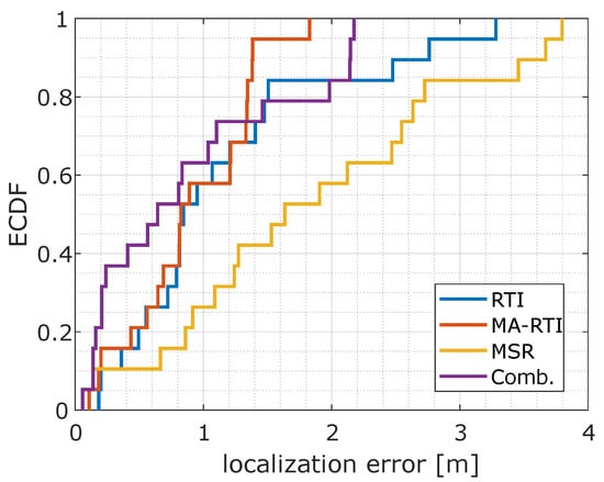 When comparing the ECDF of the combination of MA-RTI and MSR with the other DFL approaches in Figure 16, the combination provides a lower localization error than MSR and is close to MA-RTI. Figure 15d depicts the localization errors for the measurement positions. Compared to the MSR in Figure 15c, the results improved significantly. The outliers became fewer. In comparison to the results of MA-RTI, there was no clustering of the position estimates around positions 12 and 17. The combination of MA-RTI and MSR results in 50% of all cases in a localization error of 0.64 m and in 80% of all cases in 1.98 m. Therefore, the combination improves the localization for the majority of the positions.