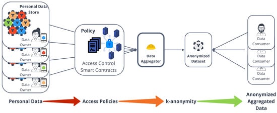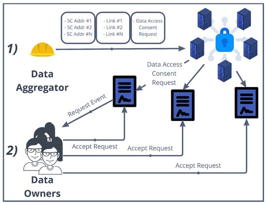 The aim of this section is to describe a possible implementation of the above architecture through a specific use case. We first describe the scenario and then we go into the details of the technical specification. With this scenario, we find ourselves in the general context of facilitating the use of privately held data for the public interest. This is in line with the vision of the European Union’s strategy on data sharing for public interest []. More specifically, the vision we intend to pursue with the implementation of our decentralized personal data marketplace is part of the intent to enable different stakeholders (government, businesses and citizens) to give access to and to use data transformed into non-personal form in order to create value and to make better decisions. In fact, the European Data Strategy elaborates on some points in this area, with components related to data governance and common data spaces, also by means of the Data Governance Act []. It enables the safe reuse of certain categories of public-sector data such as personal data.