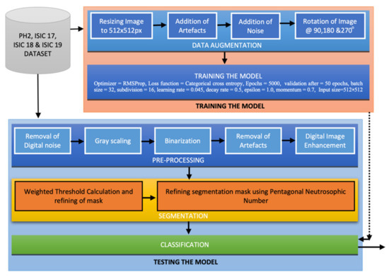 This section explains the proposed method in detail, which uses different stages of computer aided diagnosis, namely: pre-processing, segmentation, lesion localization, and classification. Novel methods for pre-processing of lesion is introduced in this paper, which not only enhances the image quality but also digitally removes the artifacts. A unique segmentation phase is proposed in the article using neutrosophy and determinant to calculate the threshold value for segmentation of the lesion. Thereafter, a modified classifier is employed for classification of skin lesion into a malignant and non-malignant class. A complete flowchart of the proposed method is pictorially represented in Figure 1. The training dataset from PH2, ISIC 2017, ISIC 2018, and ISIC 2019 repositories are used to train the proposed deep neural network. Training data are augmented before passing it to the neural network. Training data being of different resolution is difficult to train on a neural network; thus, the images are resized into 512 × 512 pm. Thereafter, digital artifacts such as hair follicles, dermoscopic ruler and frame mark and mark of blood vessels are digitally added to the training image such that the accuracy of diagnosis in the real world (for holdout datasets) increases. Digital noise is also added to each of the images such that the model performs well in a real-world scenario. Henceforth, the images are rotated at an angle of 90, 180, and 270 degrees; therefore, the training dataset is augmented to four times is original size. Then, the augmented images are passed into the proposed neural network with specific hyperparameters (more about the proposed model and hyperparameters is mentioned in Section 2.4.1 Implementation and training). The test data from the public repositories of PH2, ISIC 2017, ISIC 2018, and ISIC 2019 are used to assess the performance of the model. The test data are pre-processed by the proposed pre-processing method, which includes the removal of digital noise and artifacts. In the next stage, the image is enhanced by the process of histogram equalization. The pre-processed image undergoes the segmentation phase, where the lesion is accurately segmented using the algorithms of weighted threshold calculation, which is followed by neutrosopic-based threshold calculation of the image but segmentation of lesion. Finally, the dermoscopic lesion image is classified to be either a melanoma or non-melanoma using the proposed model.