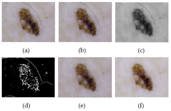 Finally, the pre-processed image undergoes the process of image enhancement by histogram equalization to adjust the brightness and contrast of each pixel. The enhanced image is further used for lesion localization and segmentation. Additionally, the efficiency of the proposed method is illustrated in the result and analysis section, which clearly depicts the efficiency of the proposed pre-processing method. Figure 2 represents the pre-processing of the dermoscopic lesion at different proposed stages.