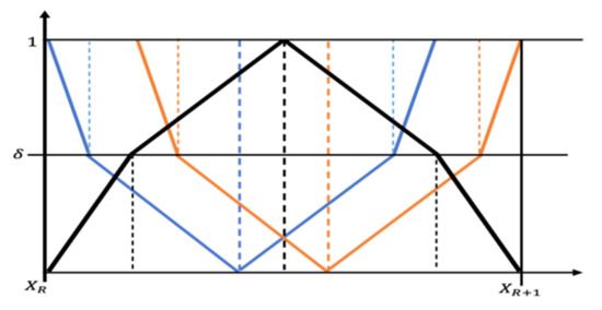 Henceforth, the segmentation mask is formed, but we can observe a fuzziness in boundaries of the segmented lesion. We are confused in case of the next phase of segmentation, as all the pixel values lie within a small bandwidth. Moreover, we are in a dilemma which pixel should be captured and which one should be discarded. Thus, for the next phase of segmentation, we will utilize the linguistic pentagonal neutrosophic number to select the threshold value of the next phase. Structure of PNN is pictorially represented in Figure 3, where false, hesitance, and truth value are represented on the y-axis as 0, , and 1, respectively. represents the possible range of threshold for segmentation of skin lesion. The neutrosophic threshold is an accurately determined probabilistic point between this range. We know that any neutrosophic number can grab degree of true, false, and indeterminacy value of a membership function in a compact way.