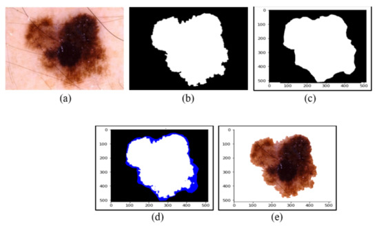 Segmentation of the dermoscopic image by the proposed method. (a) Acquired image. (b) Ground truth segmentation mask. (c) Segmented mask of skin lesion after the first phase. (d) Segmented mask of skin lesion after second phase. (e) Final segmented portion of skin lesion.