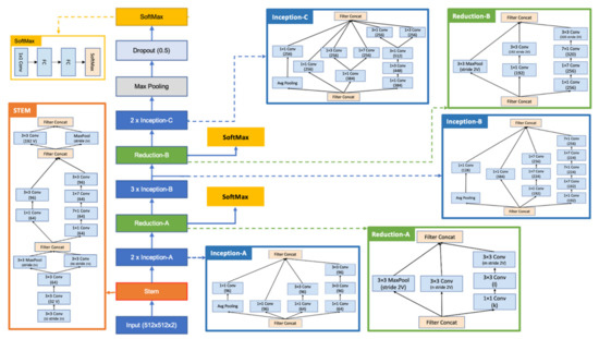 This article proposes a classifier based on the inception and residual block with a softmax block after each residual block, which makes the network wider and less deep, thereby decreasing the training time. Pictorial representation of the proposed neural network is shown in Figure 5. The network takes an input image of shape 512 × 512 px and thereafter passes it through Stem block, which is inspired from the Inception Resnet V2. It consists of series of parallel convolution layers which are concatenated to preserve the key features of the image. The Inception blocks (A, B and C) contains a series of 1 × 1 and 3 × 3 convolutional layers along with average pooling layer, such that both minor and major features are put to attention. The dimension of the image is kept like its input size, and at the end of each inception block, the filters are concatenated to produce more kernels of the same dimension. The reduction blocks (both A and B) are used to reduce the dimension of the image without losing any of the key features. The softmax block comprises of a 1 × 1 convolutional layer and two fully connected (FC) layers, followed by a softmax layer for the classification of lesion. This block is attached after every reduction unit, thereby helping in the optimization of weight and biases on the network at each stage. This technique of updating weight and biases prior to final classification helps the network to learn faster and enables it to produce a high score for accuracy. A max pooling layer is used after the Inception-C block to reduce the size of the network and keep the key value of the image; thereafter, a dropout of 50% is applied to reduce the filter size, as most of the filters might be repetitive as we have used higher value of small filters. Images from ISIC public directory are grouped into two different classes, i.e., melanoma and non-melanoma, and they are passed as the only parameter to the neural network and based on the convolution images are classified to be of either of the class. The proposed architecture of the neural network seems to produce a high value of accuracy for the classification of a melanoma lesion.