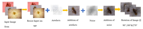 Efficient processing of dermoscopic images and accurate classification of skin lesions has emerged as a vital field of research. The accumulation of relevant datasets and accurate training of the classifier under specific parameter has always being a perplexing job. The proposed method is trained over the publicly accessible datasets of ISIC 2017, ISIC 2018, and ISIC 2019. These datasets consist reliable and easily available ground truth images that were drawn by a panel of expert dermatologist, which enable the researchers to compare and evaluate the proposed methodology. A huge set of dermoscopic data (after the process of data augmentation) not only helps the classifiers to train under rigorous conditions, but also increases the validation size, thereby producing an enhanced report of classification. The augmentation of data produces more training images from the same sample set by addition of digital noise and artifacts and rotating the image at specific angles, therefore helping the model to learn more features and classify the skin lesion accurately. Refs. [21,22] employed the process of data augmentation to increase the sample size of skin lesion image, thereby increasing the performance of the proposed model. Table 1 gives a summarized figure of total number of dermoscopic images for each dataset into training, testing, and validation, respectively. The pedro hispano hospital (PH2) dataset is a well-known dermoscopic dataset which is obtained from the Hospital of Pedro hispano, and it contains 200 dermoscopic 8-bit RGB images that are 761 × 570 to 769 × 577 pixel in dimension. It consists of 80 common nevi, 80 atypical nevi, and 40 melanoma images; this dataset is used as a hold-out dataset (used only for testing the performance of segmentation and classification) in our article. The ISIC dataset of 2017 was developed by the International Symposium on biomedical images (ISBI) organization. It contains three classes: Benign Nevus (BN), Seborrhoeic Keratosis (SK), and Malignant melanoma (MM). Image resolution of both training and testing images is ranging from 1022 × 767 to 6748 × 4499 pixels; these are 8-bit RGB images. The ISIC 2018 dataset has sources from HAM10000, and it contains 10,015 training images along with ground truth values and metadata, which contains the classification results. We have segregated 10,015 training images into 8695 images for training and 1320 dermoscopic images for testing the classifier. The ISIC 2018 dataset contains seven classes of different skin diseases. The ISIC 2019 dataset constitutes of 25,311 8-bit RGB images in the training dataset, of which 60% is used for training and 20% each for testing and validation of the proposed method. The dataset contains metadata and ground truth images for training; thus, only the training dataset is used in this research for training the classifier and evaluating it, such that we will get a result to compare our values. The dataset is derived of eight different classes: Squamous cell carcinoma, Vascular Lesion, Dermatofibroma, Benign Keratosis (Lichen planus-like keratosis, seborrheic keratosis and solar lentigo), Actinic Keratosis, Basal Cell Carcinoma, Melanocytic Nevus, and Melanoma. Each image of the dataset is resized to 512 × 512 pixels to reduce the dimensionality, such that we can perform the image enhancement and classification easily at less expensive computational cost. Henceforth, extra artifacts, such as thick and thin hair, ruler marks, and unwanted reflections and noise, are added to these replicated images, such that it can train the classifier to fetch enhanced results under any condition. Augmentation of the dataset at various angles is performed to produce a modified classification outcome, even for images acquired at a different angle. The sum of each training dataset is four times the original count, as each dermoscopic image is rotated at an angle of 90°, 180°, and 270°. The total count of dermoscopic images for training the classifier was 25,881, which is increased to 103,524 after replication of the training dataset. Therefore, a total of 115,899 dermoscopic images are used for training, testing and validation in this research article. Pictorial representation to data augmentation is illustrated in Figure 6.