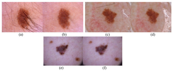 Illustration of proposed pre-processing for various artifacts. (a) ISIC_0000115 image with thick hair follicle. (b) Pre-processed output. (c) ISIC_0012395 image with ruler mark. (d) Pre-processed output. (e) ISIC_0024315 image with thin hair follicles. (f) Pre-processed output.